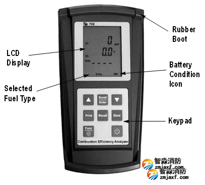 Func功能鍵用于選擇708的功能模式,讓您可以設定708作為一個燃燒分析儀,壓力表,溫度計,或可燃檢漏儀。此外,該功能鍵可用來訪問日期/和時間顯示。有關功能鍵的更多信息見第6條,