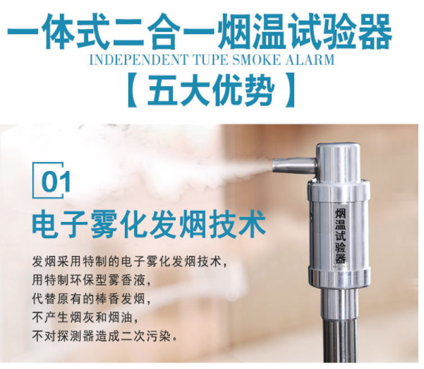 1、發煙采用特制的電子霧化發煙技術,用特制環保型霧香液,代替原有的棒香發煙,不產生煙灰和煙油,不對探測器造成二次污染。